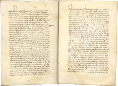 ff. 1-10, Nicolas de Clamanges (c. 1363-1437), Letter to Pope Benedict XIII, 14 April 1395, published in Du Boulay 1648, vol. 4, pp. 740-747, incipit, “Sanctissimo in christo patri domino Benedicto divina providentia sancte Romane ecclesie summo pontifici devota sue beatitudinis filia universitas studii parisiensis, devotum et humillimum cum filiali Reverentia obsequium. Quoniam, pater beatissime, ante paucorum mensium spatium ad abolendum scisma nequissimum, quod catholicam coinquinat eccleciam et letali jam tandiu vulnere sauciat … Sed et id scire volumus vestram beatitudinem quod si quodquam urgentius fortasse dictum est, non tam propter vos dictum est, quem satis voluntarium non multis egere scimus stimulis, quam propter alteram partem quam fortasse remissiorem et torpentem excitare oportebat altiori voce.”; followed by the colophon, “Placuit universitati die decimaquarta mensis aprilis anno domini millesimo CCC° nonagesimo quinto” (f. 10).